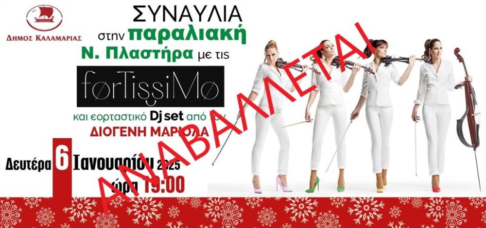 Ο Δήμος Καλαμαριάς ενημερώνει ότι προγραμματισμένη για αύριο συναυλία με τις Fortissimo στην παραλιακή οδό Νικ. Πλαστήρα, αναβάλλεται στο πλαίσιο του τετραήμερου εθνικού πένθους που κηρύχθηκε μετά τον θάνατο του Κώστα Σημίτη.