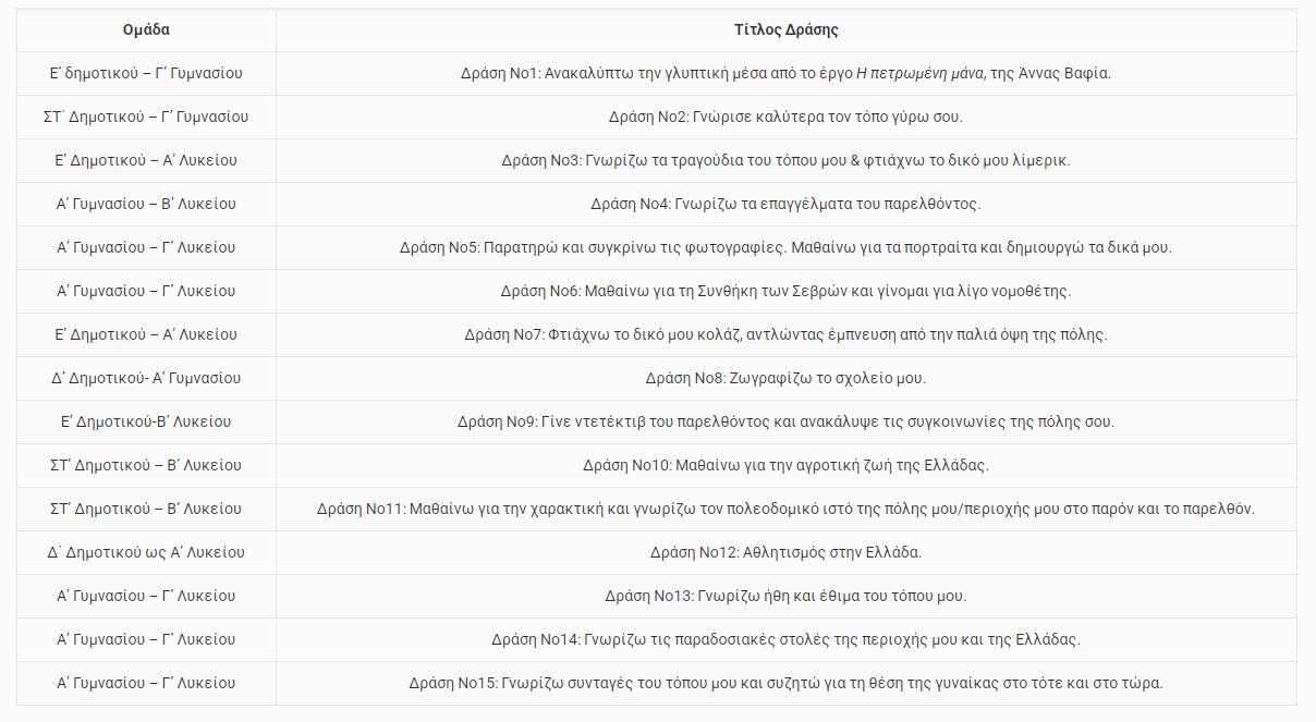 Οι δράσεις του προγράμματος περιλαμβάνουν μεταξύ άλλων εξερεύνηση της ελληνικής γλυπτικής μέσω του έργου Η Πετρωμένη Μάνα της Άννας Βαφία, δημιουργία παραδοσιακών τραγουδιών και ποιημάτων τύπου λίμερικ, κατανόηση των παραδοσιακών επαγγελμάτων του παρελθόντος, εξερεύνηση των συγκοινωνιών της πόλης ως «ντετέκτιβ του παρελθόντος», γνωριμία με την αγροτική ζωή της Ελλάδας και τη θέση της γυναίκας στο τότε και στο τώρα.