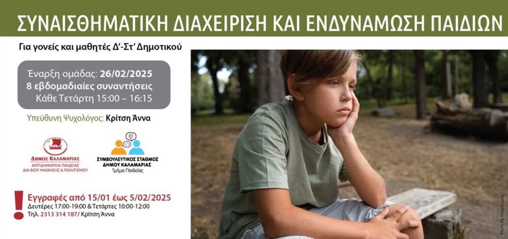 Η ομάδα «Συναισθηματική διαχείριση και ενδυνάμωση παιδιών» απευθύνεται σε γονείς και παιδιά Δημοτικού (Δ’ – Στ’ τάξη) και γίνεται στο πλαίσιο λειτουργίας του Συμβουλευτικού Σταθμού για Γονείς, Παιδιά και Εφήβους της Αντιδημαρχίας Παιδείας, Δια βίου Μάθησης & Πολιτισμού του Δήμου Καλαμαριάς. Στόχος της είναι οι γονείς να μάθουν τεχνικές ώστε να μπορέσουν να βοηθήσουν τα παιδιά τους να αναγνωρίσουν, να κατανοήσουν, να ελέγξουν και να διαχειριστούν τα δυσάρεστα συναισθήματα. Στις συναντήσεις με τα παιδιά θα μιλήσουμε για τον ρόλο των συναισθημάτων και θα γίνει εκμάθηση τεχνικών διαχείρισης των αρνητικών συναισθημάτων (άγχος & θυμός). Μέσα από βιωματικές ασκήσεις, παραμύθια, παιχνίδια ρόλων και συζήτηση, τόσο οι γονείς όσο και τα παιδιά θα αποκτήσουν δεξιότητες όπως: αναγνώριση και έκφραση συναισθημάτων, αυτοέλεγχος, επίλυση συγκρούσεων και προβλημάτων και ποιοτική επικοινωνία.