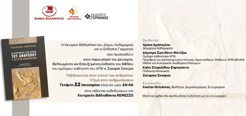 Με αφορμή την κυκλοφορία της δεύτερης, βελτιωμένης και επαυξημένης έκδοσης του βιβλίου του Ζαχαρία Σκούρα με τίτλο «Ταξιδεύοντας στην εποχή του ανθρώπου. Η ζωή στην ανθρωπόκαινο», διοργανώνεται την Τετάρτη 22 Ιανουαρίου μια ξεχωριστή εκδήλωση με ομιλητές τη Δήμαρχο Καλαμαριάς, Χρύσα Αράπογλου, την ομότιμη καθηγήτρια του ΑΠΘ, Δήμητρα Σφενδόνη-Μέτζου, την πολιτικό μηχανικό Καίτη Σταφυλίδου-Σαρηγιάννη και φυσικά τον συγγραφέα.