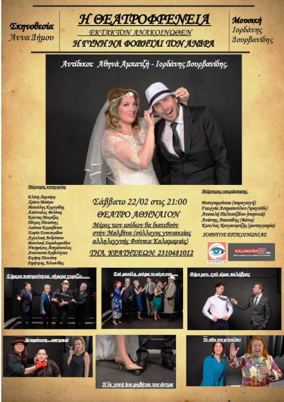 *Η θεατροφρένεια εκτός από τις υπέροχες θεατρικές παραστάσεις που ανεβάζει, είναι γνωστή και για το εθελοντικό της έργο, έτσι δείχνοντας την αγάπη του και την στήριξη της μέρος των εσόδων από την παράσταση του Σαββάτου 22/02 θα διατεθούν στον Σύλλογο Γυναικείας Αλληλεγγύης Φοίνικα - Καλαμαριάς Μαλβίνα.