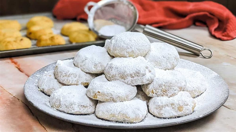 - Τυλίγουμε τους κουραμπιέδες στην άχνη.
