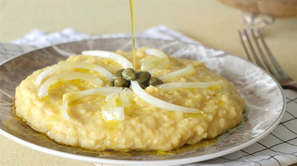 • Αδειάζουμε τη φάβα σε πιατέλα, σκορπίζουμε το κρεμμύδι, τη ρίγανη και περιχύνουμε με το ωμό ελαιόλαδο.
