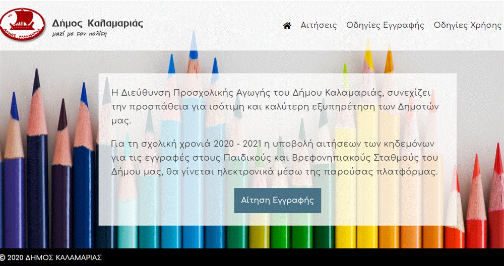 Οι αιτήσεις εγγραφής και επανεγγραφής για το σχολικό έτος 2020-2021, υποβάλλονται στο Δήμο Καλαμαριάς μέσω της ψηφιακής πλατφόρμας στην ηλεκτρονική διεύθυνση https://eservices.kalamaria.gr (Αιτήσεις Παιδικών Σταθμών) και θα συνεχίσουν και στο μέλλον να υποβάλλονται ηλεκτρονικά.