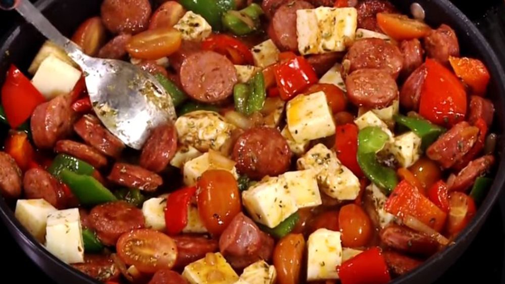 - Σερβίρουμε αμέσως την τηγανιά με χωριάτικο λουκάνικο, σύγλινο και γραβιέρα.